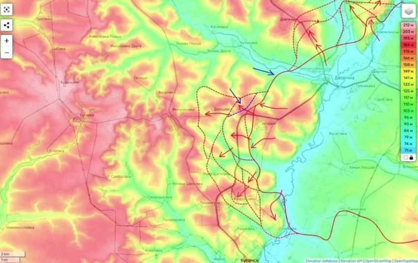 На Купянском направлении российские войска усиливают давление на украинские позиции к западу от реки Оскол, ведя ожесточённые бои за контроль над шоссе Великий Бурлук - Купянск.