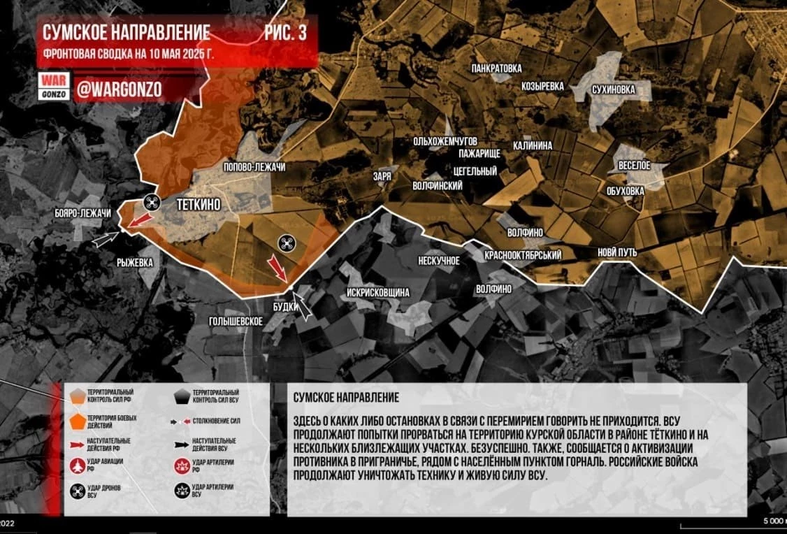 В течение суток 9 мая российские войска в составе подразделений Северной группировки войск уничтожали ВСУ на Теткинском и Глушковском направлениях; украинские силы на бронетехнике и в пешем порядке пытались прорваться в Курскую область, сообщил Telegram-канал «Северный ветер».