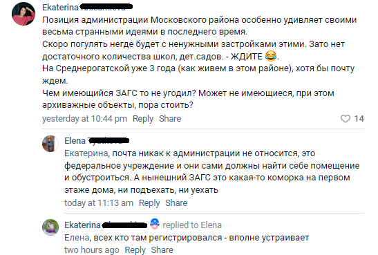 «Хватит сокращать территорию парка! Лучше посадите ещё деревьев и обеспечьте им должны уход, чтобы они прижились. А вы в итоге замахиваетесь на территорию, где растут прекрасные взрослые деревья. Лучше бы человейников строили поменьше. В ЗАГС Московского района очередей нет. Если стоит вопрос о торжественной регистрации рождении, то большинство все равно поедет во Дворец N 2, и изменить это очень сложно. Лучше уж в центре города среди заброшенных зданий отремонтировать то, которое дополнительно возьмёт на себя функцию торжественных регистраций рождений», - высказала свою позицию местная жительница Московского района.