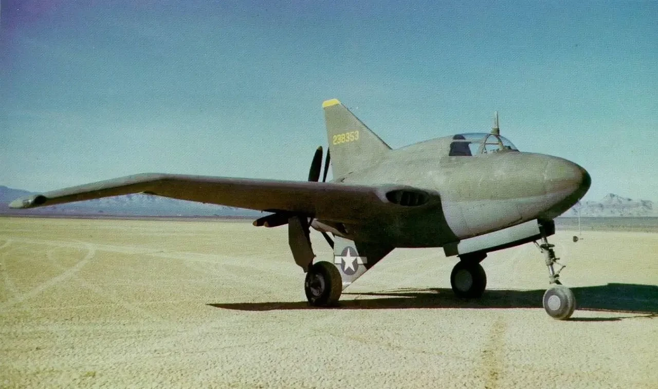 Второй экспериментальный прототип Northrop XP-56 Black Bullet, окрашенный в стандартные армейские цвета того времени. Обратите внимание на свисающие законцовки крыла, толкающие винты противоположного вращения и воздухозаборники крыла, подающие воздух к радиальному поршневому двигателю воздушного охлаждения, расположенному позади пилота в фюзеляже.