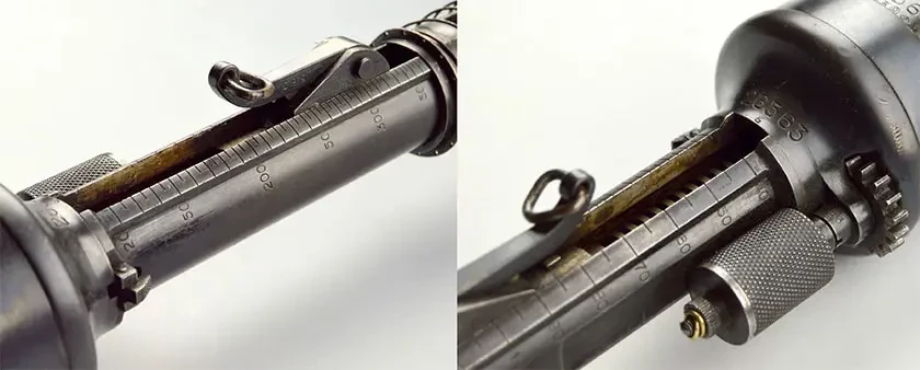 Две шкалы дальности, при угле возвышения ствола 45 градусов от 120 до 670 метров для снаряда типа 89 и от 36 до 180 метров для гранаты модели 91.