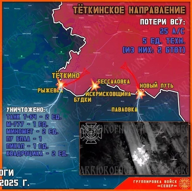 В утренние часы на направлении Рыжевка - Тёткино в результате нашего комплексного огневого поражения уничтожена боевая группа противника: большая часть оккупантов ликвидирована, оставшиеся в живых бежали вглубь Сумской области.