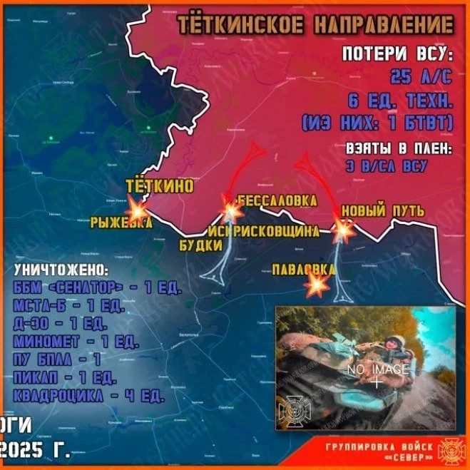Непосредственно в окрестностях Тёткино завершается уничтожение разрозненных групп ВСУшников. Организована и ведется непрерывная воздушная разведка для срыва очередных попыток противника прорваться на нашу территорию.
