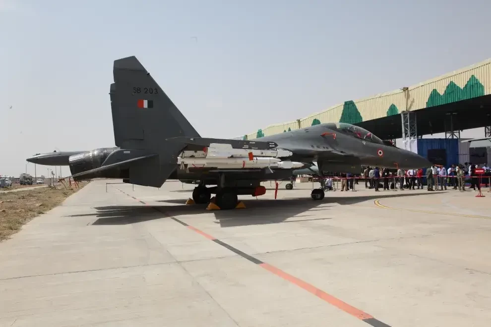 Су-30МКИ ВВС Индии с ракетой Р-73, установленной на законцовке крыла, и ракетами Р-77 и Р-27, установленными внутри.