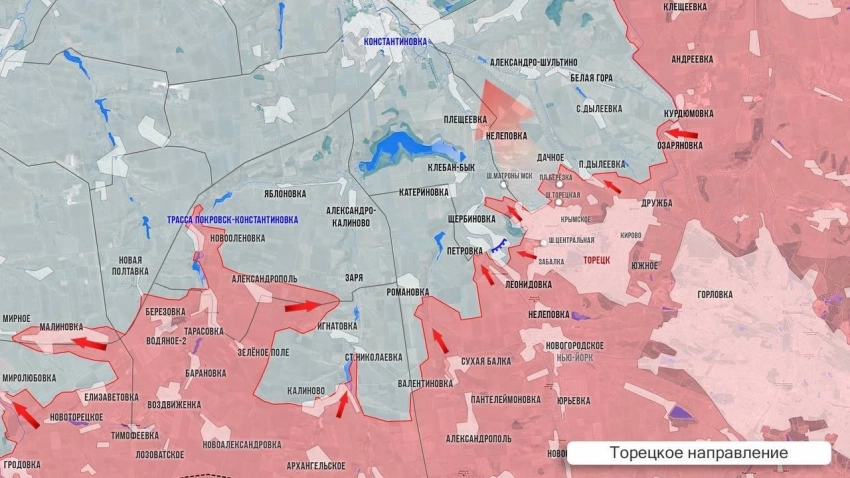 Западнее Торецка направления продолжаются бои за Новую Полтавку. Ресурсы противника сообщают о боях на юго-западной окраине Яблоновки, к которой наши штурмовики несколько дней продвигались вдоль русла реки Бычок. После вчерашнего прорыва от Александрополя, бои идут неподалёку от Зари. В Старой Николаевке и Романовке есть тактические успехи. К северу от Торецка продолжаются бои в районе п. Дылеевка и к северу от него, сообщает Олег Царёв в своём Telegram-канале.
