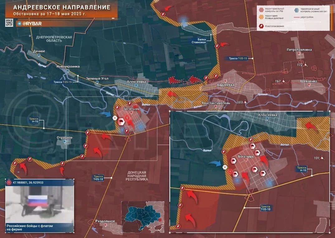 На Угледарском фронте ВС РФ штурмуют Новополь и соседнее Зелёное Поле, отбили несколько лесополос западнее Вольного Поля, зачистив почти 3 кв км. В районе Отрадного закрепились на господствующих высотах на юго-восточной окраине, заняв позиции на фронте до 1,5 км. МО объявило об освобождении Богатыря. Из разных точек села приходят подтверждающие видео. Богатырь – последний форпост ВСУ перед границей с Днепропетровской обл. От Богатыря до границы с Запорожской областью у противника больше нет серьёзных укрепрайонов. Кроме этого, теперь армия России контролирует сразу несколько участков важных автомобильных дорог – на днепропетровскую Новопавловку и дорогу на Запорожье и может продвигаться как на северо-запад, так и на юго-запад от Богатыря.