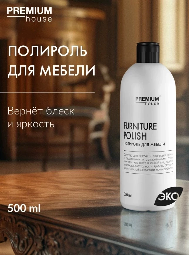 Полироль Premium House заслуженно входит в «лучшая полироль для мебели рейтинг» благодаря эффективному уходу за деревянными и лакированными поверхностями. Средство восстанавливает блеск и яркость, придаёт поверхности ухоженный вид, а антистатический эффект защищает от пыли. Уникальный древесный аромат и антибактериальные свойства делают его универсальным помощником в домашней уборке. Наносится легко — небольшое количество на салфетку, и поверхность мгновенно сияет без разводов. Рекомендовано хранить при умеренной температуре, средство безопасно при правильном применении.