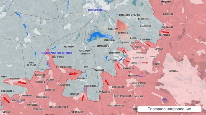 На западном фланге Торецкого направления ВС РФ продолжают рассекать оборону врага на север от Новой Полтавки. Бои приближаются к Полтавке, Попову Яру и Русину Яру. В украинских соцсетях всё больше сообщений о том, что наши операторы дронов бьют технику ВСУ на трассе из Краматорска в Доброполье. Бои продолжаются в Яблоновке, от которой до Константиновки уже меньше 10 км. Продолжаются бои в Заре и зачистка в Романовке. В Игнатовке и Старой Николаевке противник держит позиции, несмотря на то, что фактически оказался в котле.