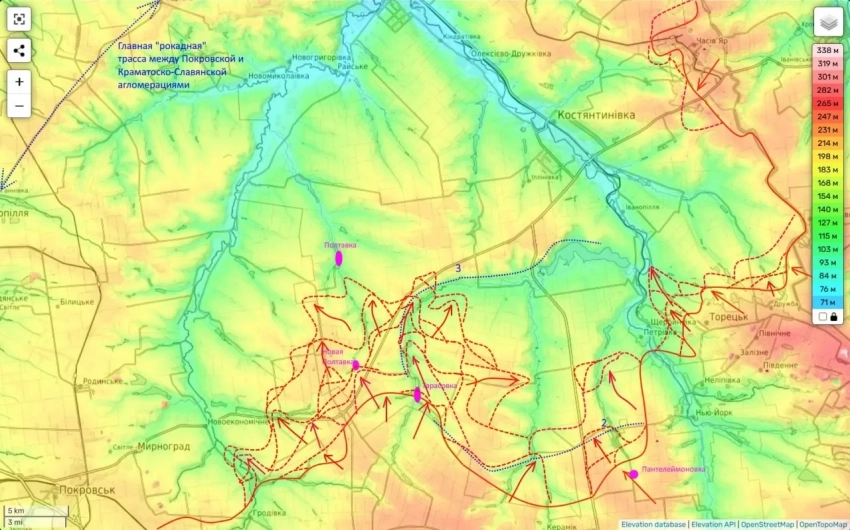 Четыре дня назад российские подразделения штурмовали Новую Полтавку, а уже вчера вышли на южную окраину Полтавки, приблизились к Попову Яру и с двух направлений подошли к селу Шевченко 1-е. Параллельно ВС РФ продвигаются по трассе Покровск-Константиновка, обходя Яблуновку с севера и приближаясь к Степановке.