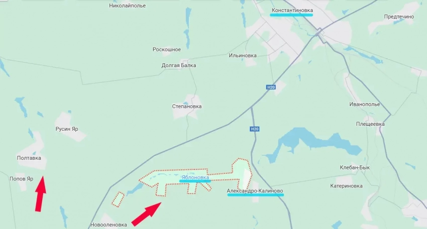 Российские войска, продвинувшись южнее реки Бычок, взяли под контроль ещё около 6-7 квадратных километров территории, расширив зону контроля у села Яблоновка. Это небольшое, но вытянутое с запада на восток село, которое фактически стыкуется с селом Александро-Калиновка, что у Клебан-Быкского водохранилища. От этих участков территории до Константиновки около 8 км.