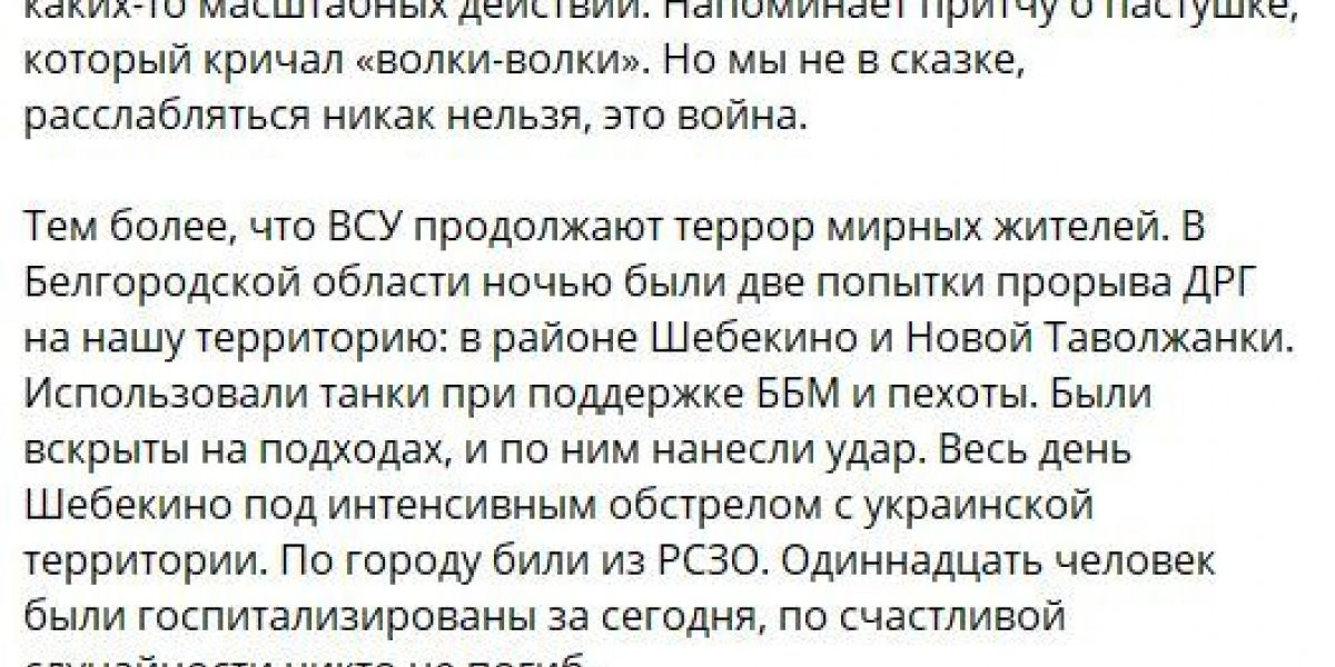 Рано утром начался бой на КПП, который подвергся обстрелу из танков и артиллерии. Под Новой Таволжанкой противник пытался продвинуться силами до роты. А накануне украинские формирования несколько суток били по самому Шебекино, а не военным объектам и укреплениям.