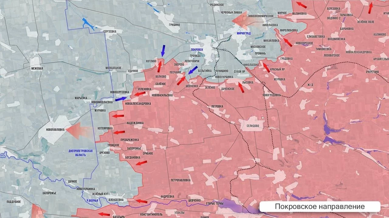 На Покровском фронте активизировались бои с нашей стороны. Западнее Богдановки, Троицкого и Котляровки ВС РФ стараются выровнять фронт вдоль границы с Днепропетровской обл. Ожесточённые бои идут за Новониколаевку и Новосергеевку. В районе Муравки противник контратакует, часть позиций в лесополках южнее села переходит из рук в руки. ВС РФ активнее проверяют оборону противника севернее Зелёного и Нового Труда. Со стороны Шевченко Первого ВС РФ начали продвигаться к Коптево.