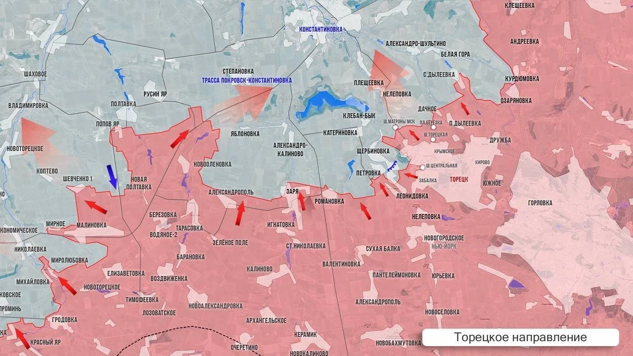 На западном фланге Торецкого направления идут упорнейшие бои в Полтавке и Русин Яре. Противник стягивает сюда доступные резервы, чтобы удержать важный рубеж обороны. «Карман» южнее Зари, как и само село, фактически зачищены. Продвигаясь в направлении на Александро-Калиново и Катериновку, ВС РФ смогут зайти с фланга в Петровку и Щербиновку. В северной части Торецка сообщают об освобождении п. Дачное и п. Дылеевка, а также о тактических успехах в с. Дылеевка.