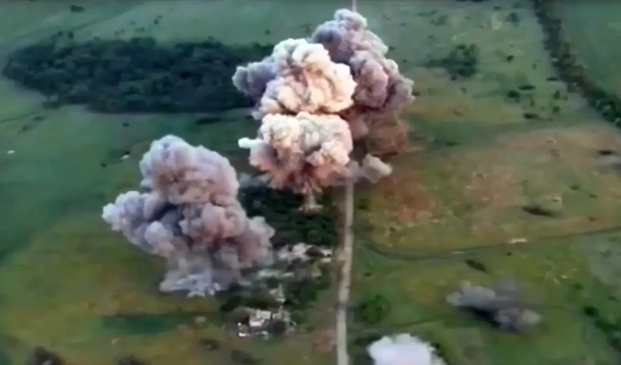Не уточняется, какого именно калибра «чугунии» с УМПК по ПВД ВСУ (вероятно, по 250) в Новоэкономическом применили наши лётчики, но получилось эпично. Было три или четыре прилета фугасных авиабомб. Все они очень точно, словно по линейке, легли еще и вдоль дороги. Так что нельзя исключить, что момент ударов совпал и с передвижением мехколонны противника, хотя дальность съемки точно определить это не позволяет.