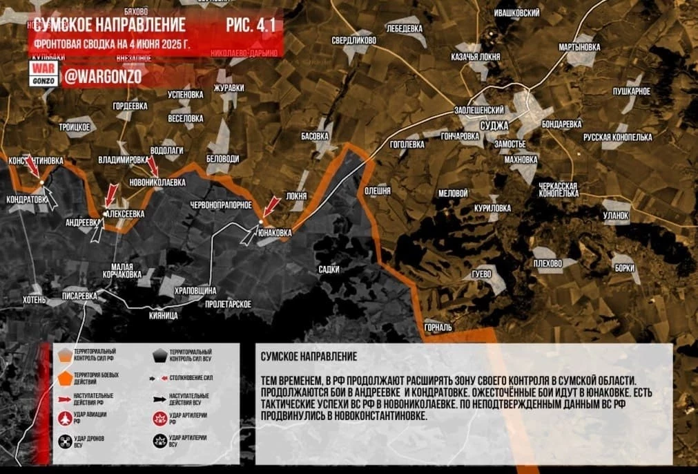 На Сумском направлении ВСУ продолжают попытки вклиниться в нашу оборону на Тёткинсном участке, подтягивая дополнительные силы и бросая их в бой, но каких-то осязаемых результатов добиться не могут. Тем временем, В РФ продолжают расширять зону своего контроля в Сумской области. Продолжаются бои в Андреевке и Кондратовке. Ожесточённые бои идут в Юнаковке. Есть тактические успехи ВС РФ в Новониколаевке. По неподтвержденным данным ВС РФ продвинулись в Новоконстантиновке.