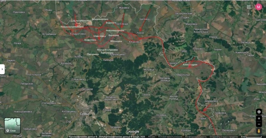 По данным Юрия Подоляки, наступательная операция ВС России продолжается севернее Сум. Накануне бойцы армии РФ смогли установить контроль над двумя населёнными пунктами - Варачино и Новоконстантиновкой.