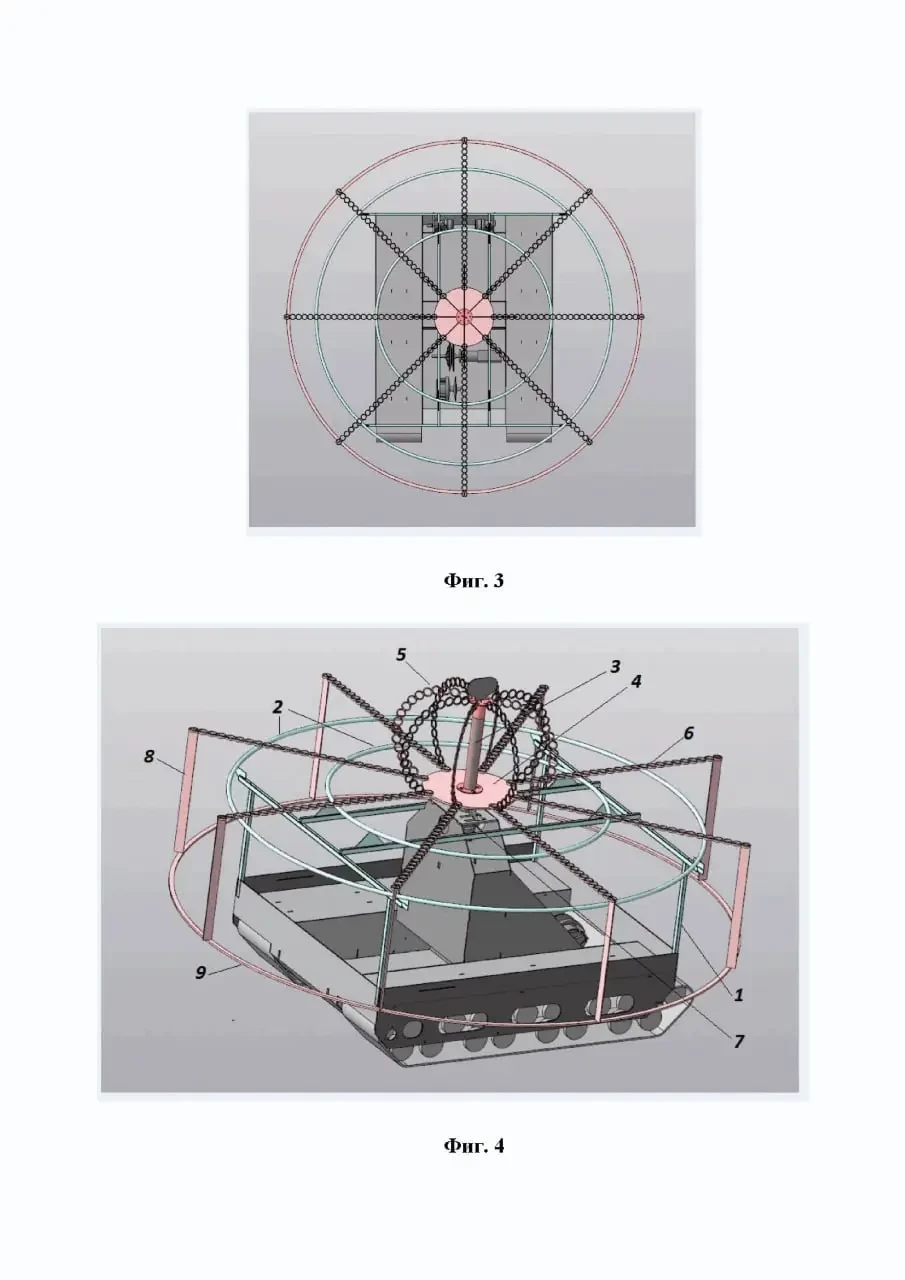 Ещё одним вариантом защиты кормы танка от FPV-дронов можно назвать содержание патента под названием «Способ модернизации боевой машины с целью защиты от дронов-камикадзе и устройство для его осуществления». Авторы также из нижнетагильского «УКБТМ». Изделие несложно и представляет собой заборчик из гибкого и прочного материала, прикрывающий от атакующих камикадзе. Профиль преграды чуть превышает высоту башни и, в отличие от предыдущего изделия, не позволяет вести огонь с кормы.