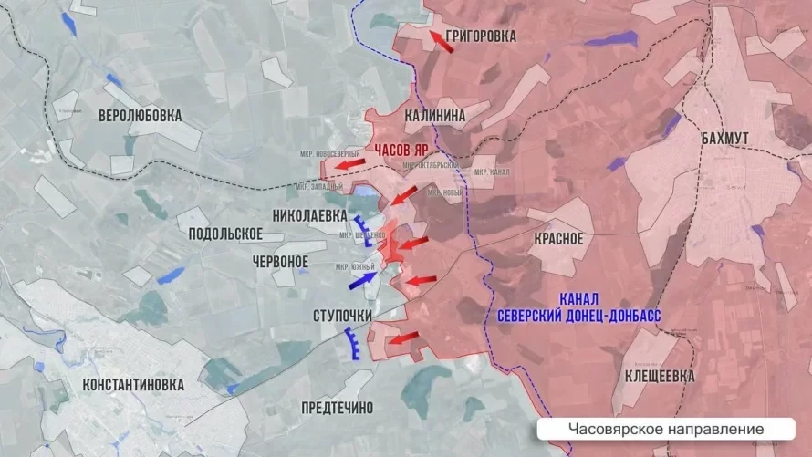 В Часовом Яре наши бойцы тяжело продвигаются в центральной части, а также на севере – в районе карьеров, и на юге – в районе Ступочек. Враг готовится к обороне в Предтечино, что находится в трёх километрах от Константиновки.
