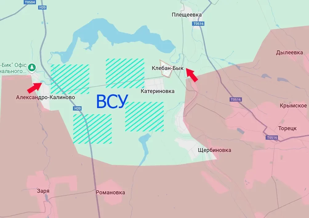 Учитывая выход ВС РФ к водохранилищу с запада (в районе названного села Александро-Калиново) и с востока (в районе станции Клебан-Бык) у реки Кривой Торец, можно констатировать, что противник на этих территориях оказался в окружении. С востока и запада – российские войска – с севера то самое Клебан-Быкское водохранилище.