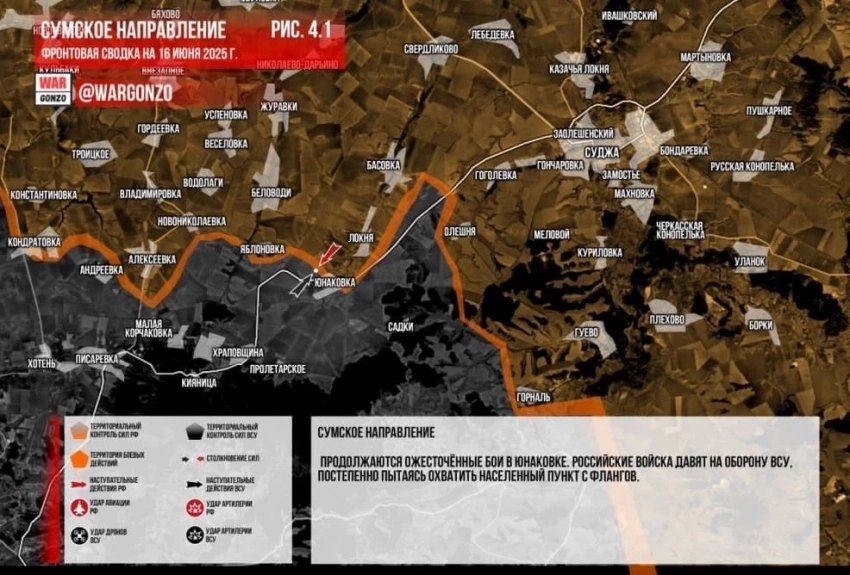 На Сумском направлении не смолкают ожесточённые бои в Юнаковке. Российские войска давят на оборону ВСУ, постепенно пытаясь охватить населенный пункт с флангов. Украинские войска предпринимают очередные попытки атаковать позиции ВС РФ в Тёткино. Отбито не меньше двух накатов, личный состав ВСУ, участвовавший в наступлении, уничтожен или обращен в бегство.