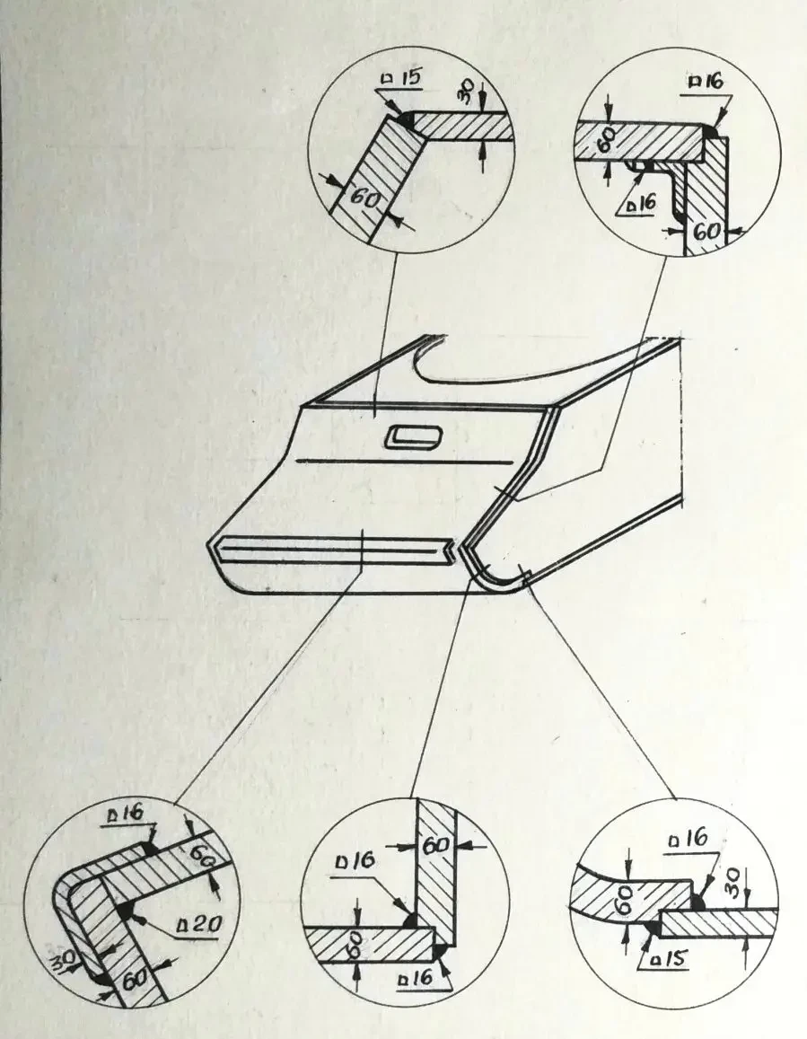 6. Соединения крыши с лобовыми деталями и подкрылками может быть выполнено с необходимой прочностью и живучестью путем стыкования в распор, четверть и шип с применением для наружных швов аустенитовых электродов и для внутренних швов качественных электродов.