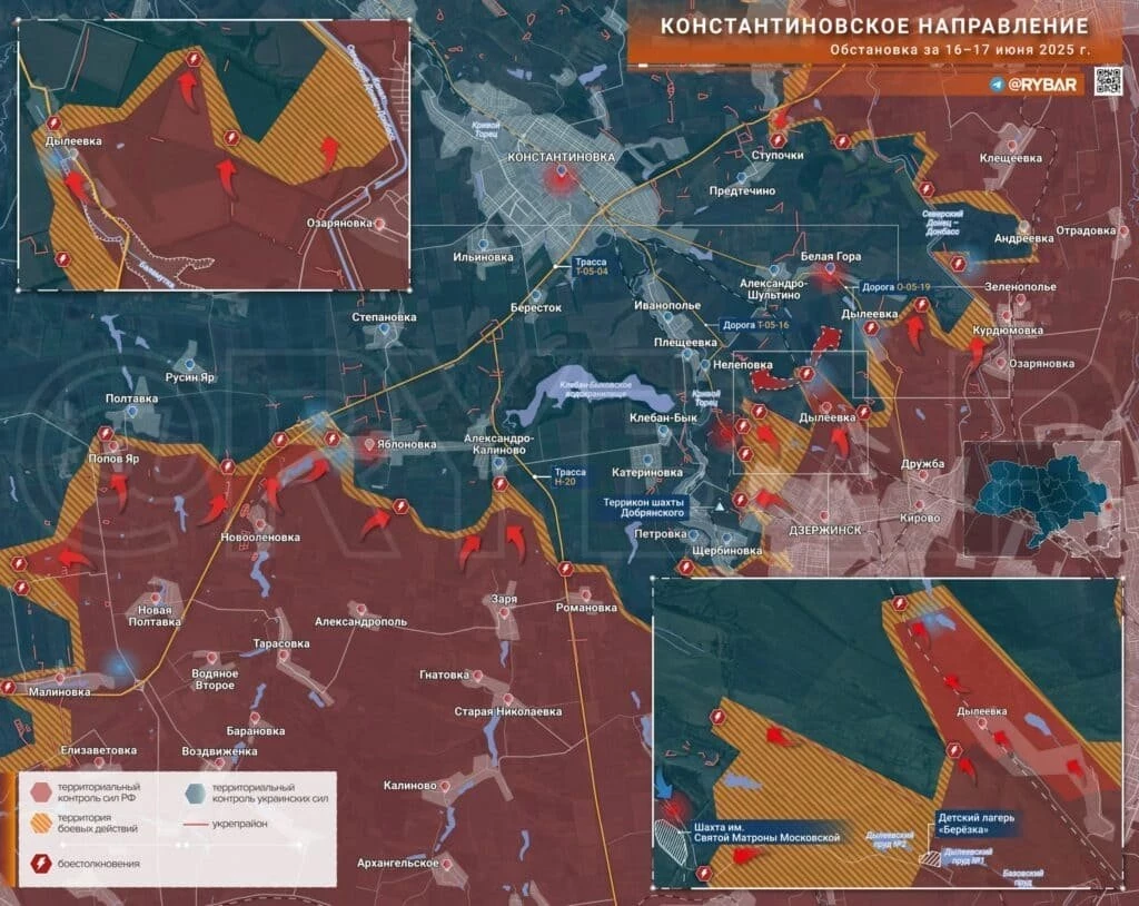 Еще одно продвижение, согласно карте мониторингового ресурса, есть в двух местах к югу от Константиновки.