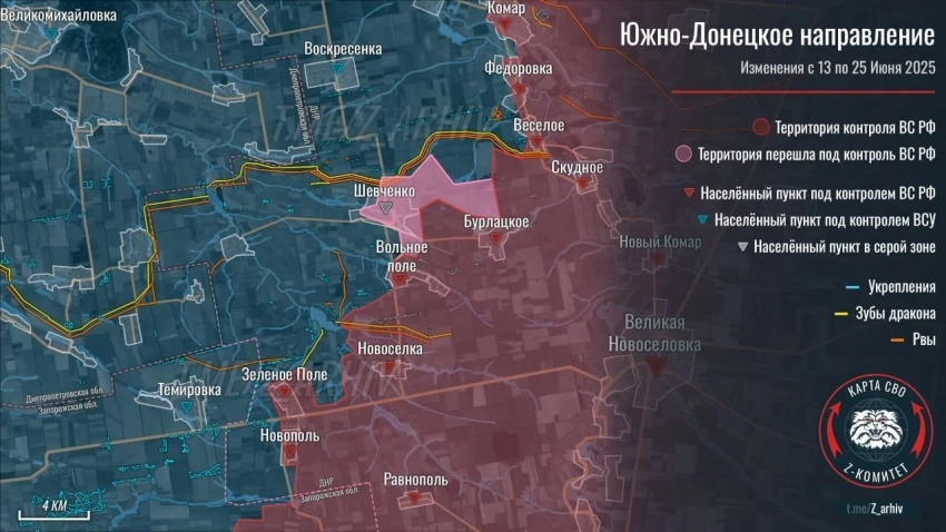 На Запорожском направлении ВС РФ расширили контроль территории в районе Шевченко, западнее Днепроэнергии, давят в направлении Воскресенки, продолжаются встречные бои в Малиновке.