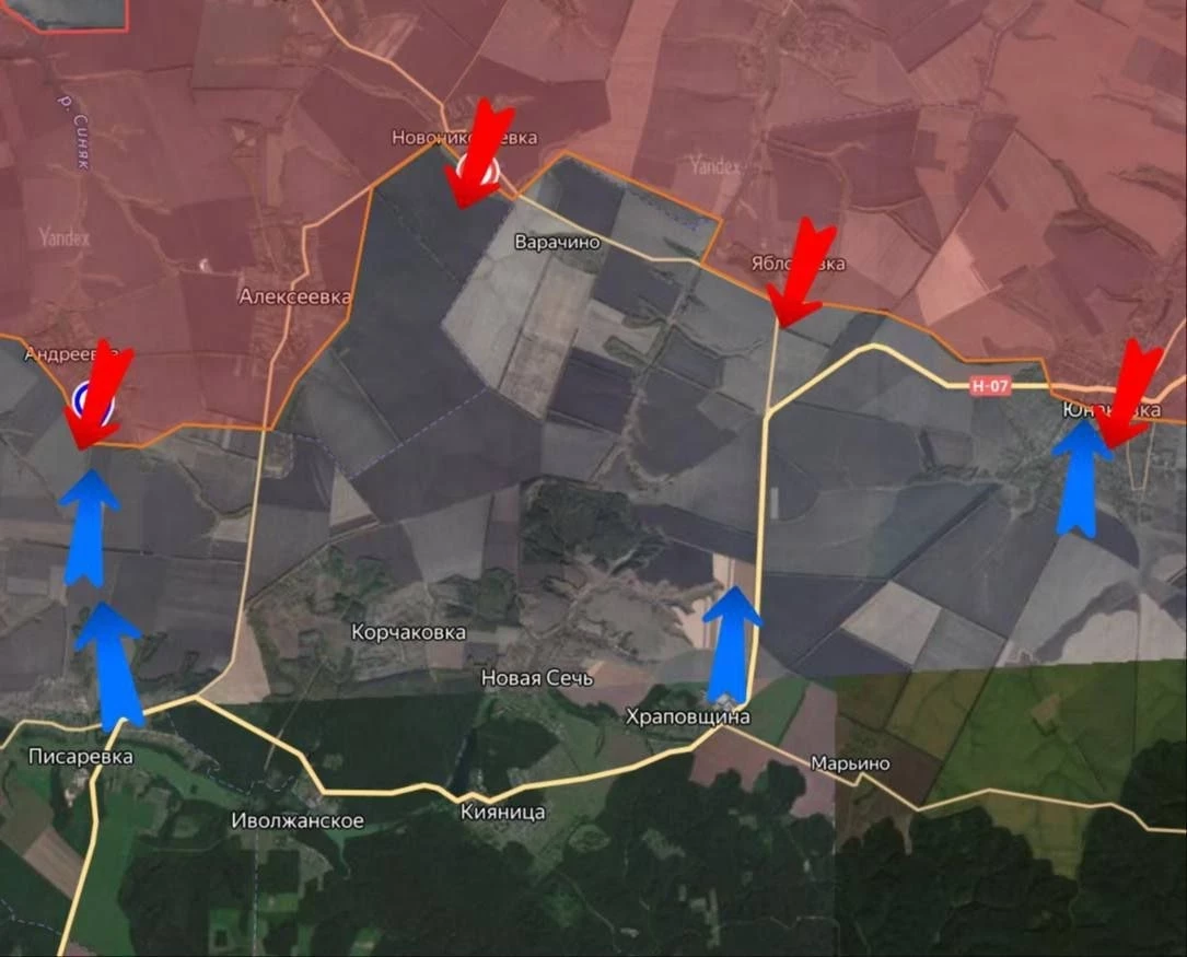 На Сумском направлении армия Российской Федерации практически полностью освободила село Юнаковка. Продвижение составило+4,3 км2. Более 30 солдат элитного британского взвода ВСУ уничтожили наши войска в результате этого сражения. Враг пытается вернуть Андреевку, контратакуя наши позиции. Наши дроны находят и поражают вражеские группы. Из Храповщины в сторону Яблоновки противник атаковал на танке. Российские солдаты подбили его при отступлении.
