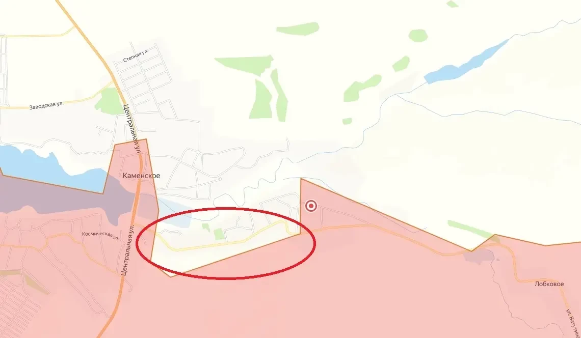 Таким образом, можно отметить устойчивую тенденцию выдавливания ВСУ из «кармана» между населенными пунктами Каменское и Лобковое. В настоящее время украинские формирования контролируют лишь небольшой участок вдоль южного берега впадающей в бывшее Каховское водохранилище реки. Село Каменское расположено на высотах и имеет чрезвычайно важное тактическое значение — контроль над этим населенным пунктом позволит обстреливать украинские позиции в оккупированном Запорожье из ствольной артиллерии. В настоящее время российский флаг уже поднят в районе моста, расположенного в самом центре Каменского.