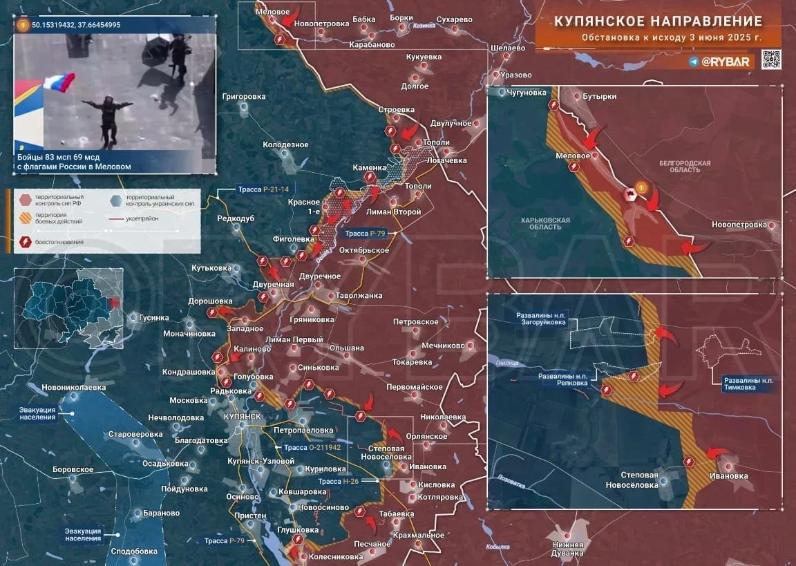 На Купянском направлении ВС РФ расширяют подконтрольную территорию южнее Кондрашовки. Есть тактические успехи севернее Петропавловки. МО РФ сообщило об освобождении с. Меловое, что в 23 км к северо-западу от Тополей и примерно на таком же расстоянии от Великого (Большого) Бурлука - важнейшего логистического узла для снабжения ВСУ на Харьковском и Купянском направлениях.