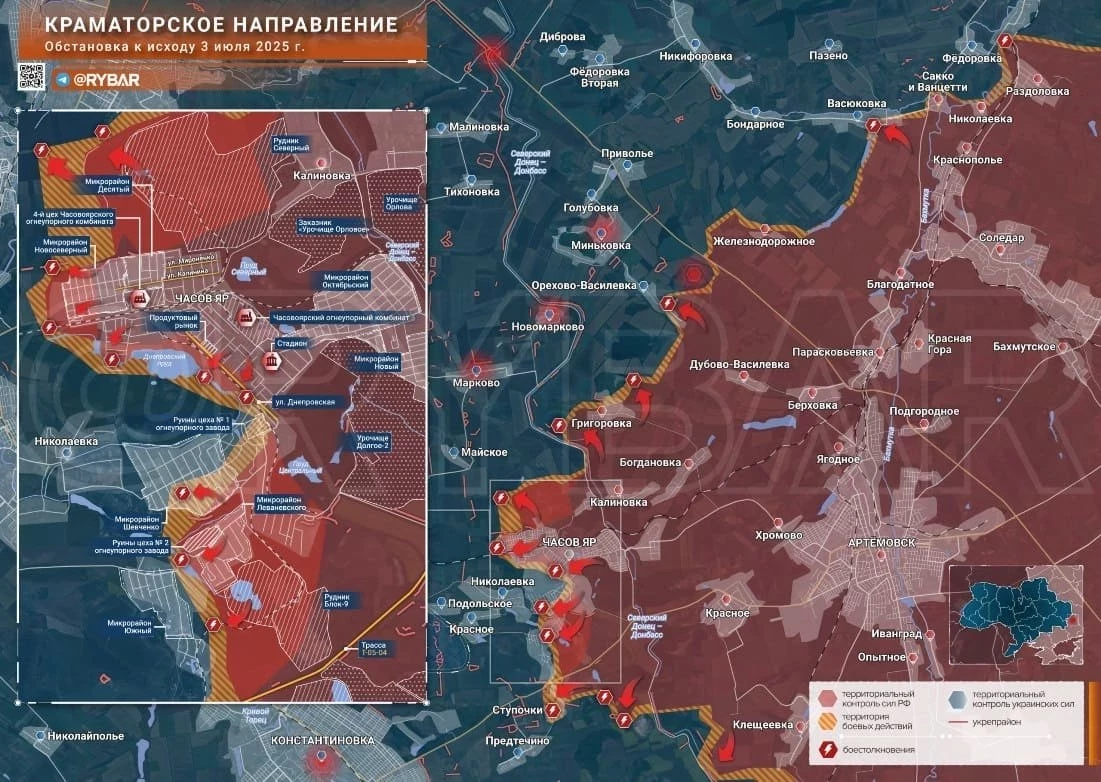 В Часов Яре продолжается тяжелейшее сражение за город. Враг имеет преимущество в дронах и наносит удары по всей территории города. На земле ВС РФ продвигаются и зачищают мкр. Шевченко. Наши штурмовики вышли к северным окраинам Николаевки и наносят удары, в том числе, по позициям врага в Червоном. В районе Ступочек тяжелые встречные бои, отмечает Олег Царёв в своём Telegram-канале.