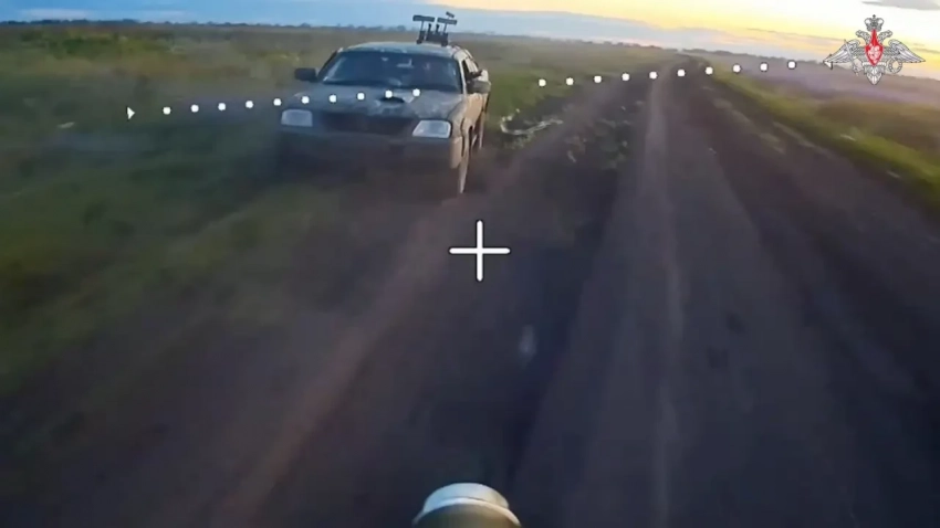 Боевое применение БПЛА «КВН». На переднем плане — машина противника с комплексом РЭБ. Беспилотник игнорирует её и движется к цели. Фото Telegram / «Хроника оператора БПЛА»