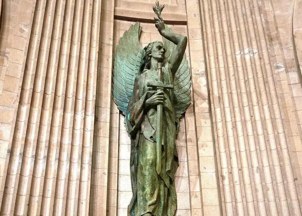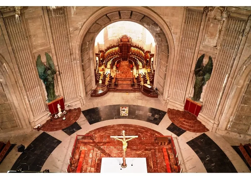 Длинный проход с боковыми капеллами и стенами, украшенными гобеленами и фресками с изображениями святых — покровительниц Армии, Флота, ВВС и Гражданской Гвардии, ведет к главному алтарю, у подножия которого ранее находились могилы Франсиско Франко и Хосе Антонио Примо де Риверы. Прямо перед входом в главное церковное пространство две огромные статуи ангелов с мечами охраняют вход, как ангелы Рая.