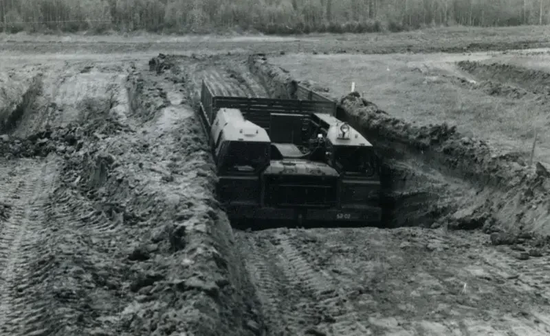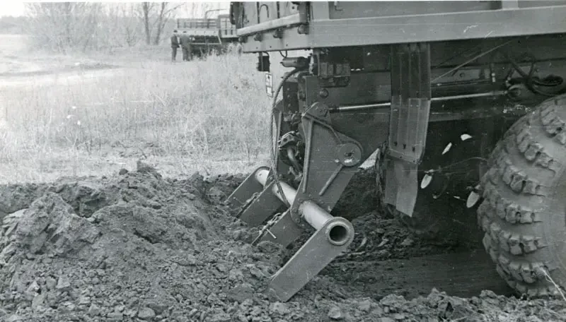 Решено было не толкать перед собой отвал, а тянуть специальное землеройное оборудование. Предполагалось, что тягово-сцепные свойства колесного движителя вкупе с мощными моторами обеспечат необходимое усилие для снятия слоя грунта. В 1969 году совместным решением Министерства автомобильной промышленности и войсковой части 52694 была утверждена тема 5567-1 «Разработка навесного автомобильного оборудования для отрытия котлованов и самоокапывания одиночного автомобиля». Но еще раньше – в 1967 году – ЦК КПСС и Совет Министров СССР выпустили постановление № 37-10, которое очертило общие контуры будущей работы. Техническими деталями и требованиями к самоокапывателям колесной техники занимались в 21-м НИИ в Бронницах.