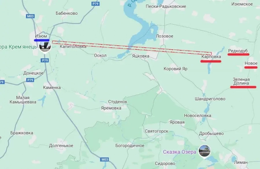 Также это выход на расстояние применения обычной артиллерии к харьковскому Изюму. На данный момент от передовых позиций нашей армии в районе Карповки до восточной окраины Изюма – около 30 км.