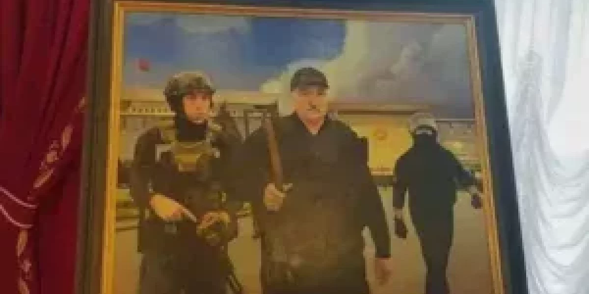 Картина, где Лукашенко и его младший сын в амуниции спецназа во время протестов в 2020 г. Полотно подарили президенту. Кто автор, не сообщается