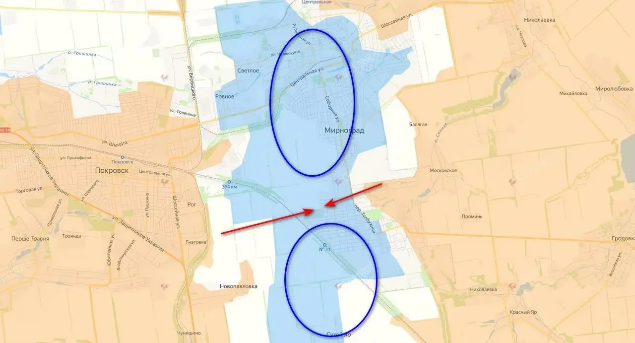 ВС РФ рассекли Покровскую воронку на две части. Теперь выход с нижней части невозможен. Все военные, оставшиеся в южной части Мирнограда, — смертники. Даже если ВСУ удастся в какой-то момент пробить «крышку котла» с севера (со стороны Родинского), то это никак не поможет этим подразделениям.