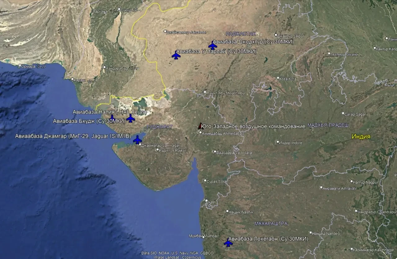 Схема дислокации истребительных эскадрилий Юго-Западного воздушного командования ВВС Индии