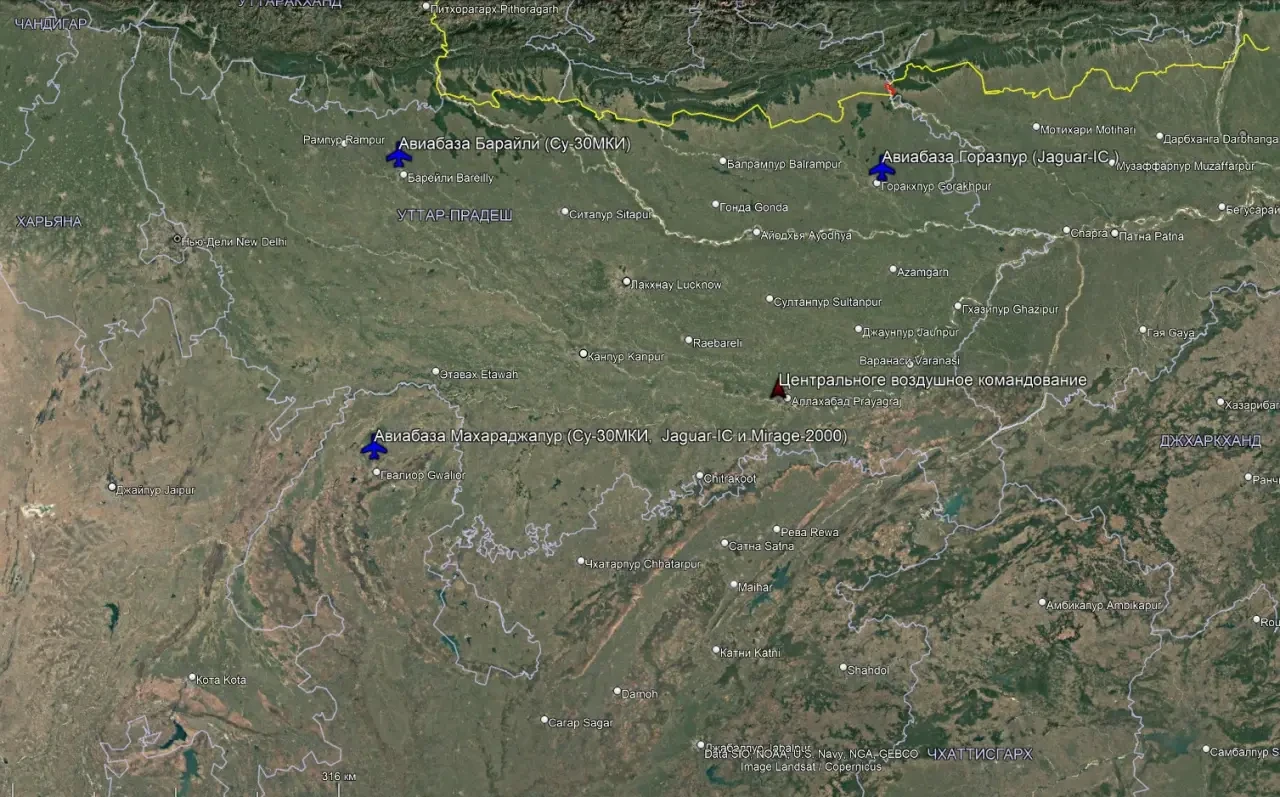 На трёх авиабазах: Барайли, Горакхпур и Махараджапур дислоцировано восемь эскадрилий Су-30МКИ, Jaguar-IС и Mirage 2000.