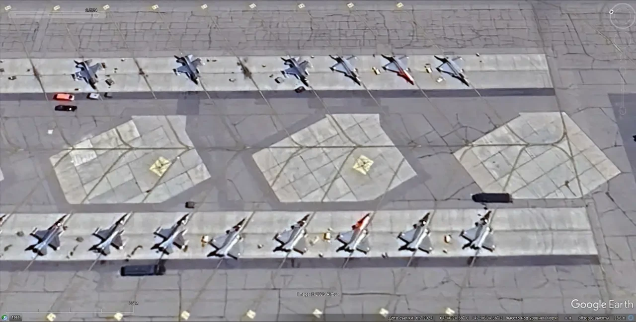 Спутниковый снимок Google Earth: индийские истребители Rafale на стоянке авиабазы Эйлсон рядом с американскими F-16. Снимок сделан в июне 2024 года