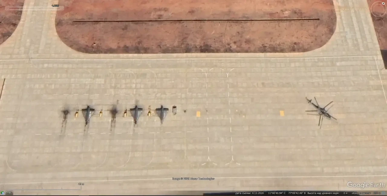 Спутниковый снимок Google Earth: истребители Tejas и боевой вертолёт Ми-35 на стоянке авиабазы Силур. На снимке видно, что истребители Tejas по длине меньше, чем ударный вертолёт Ми-35