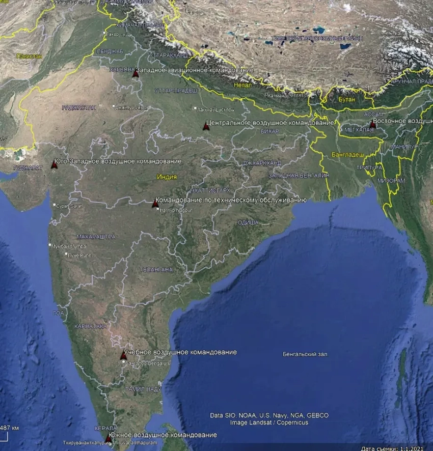 Схема дислокации истребительных эскадрилий Южного воздушного командования ВВС Индии