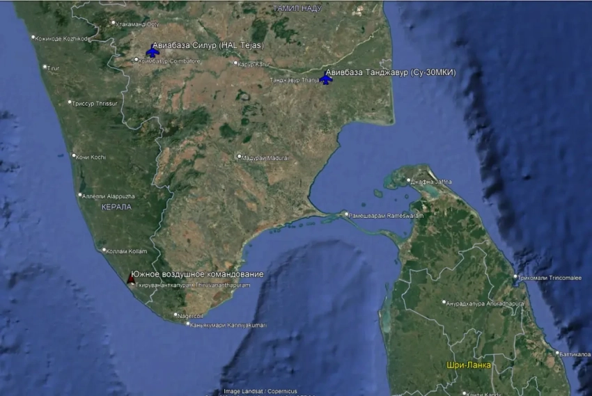 Спутниковый снимок Google Earth: истребители HAL Tejas на стоянке авиабазы Силур, находящейся под управлением Южного воздушного командования
