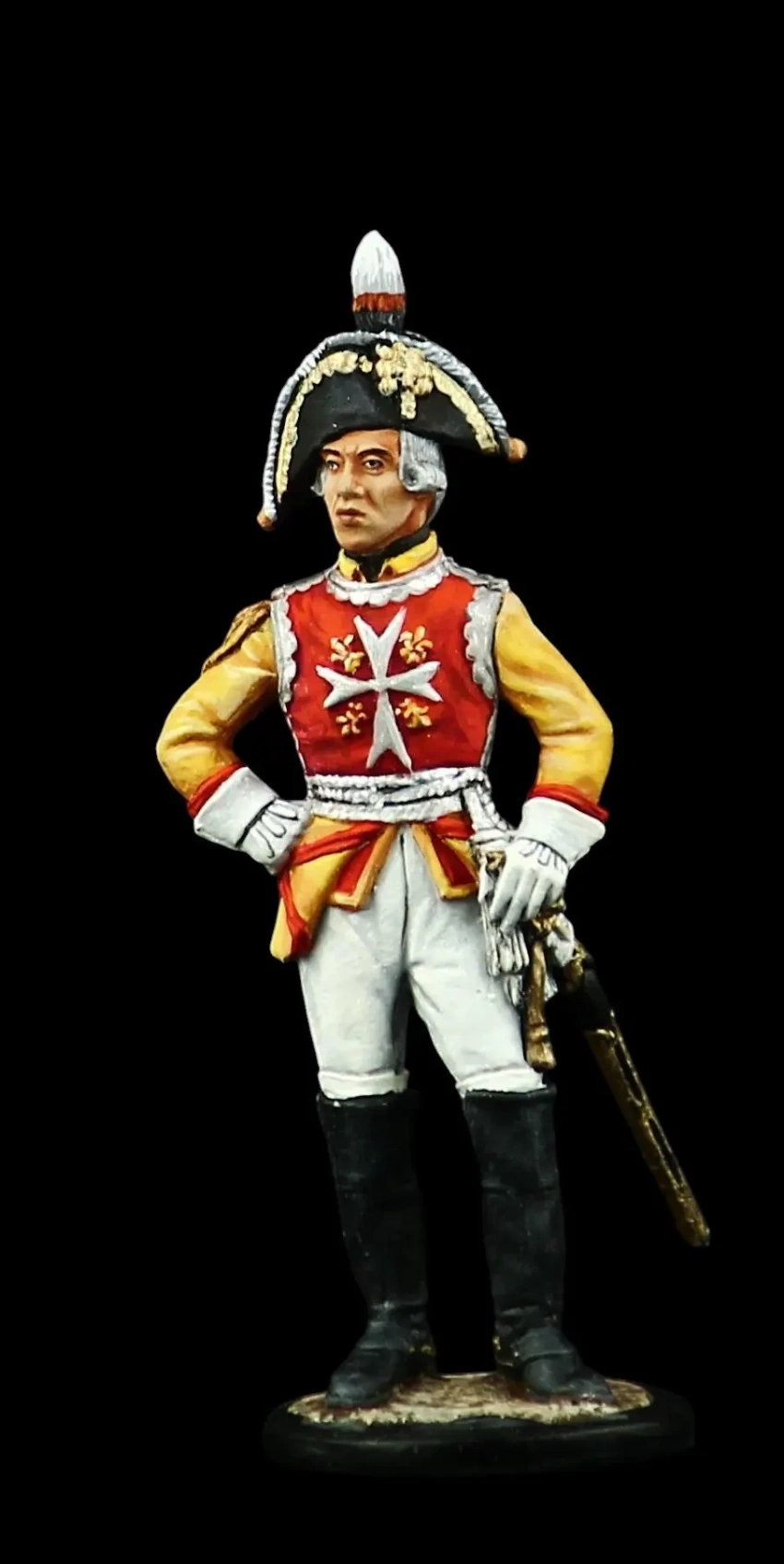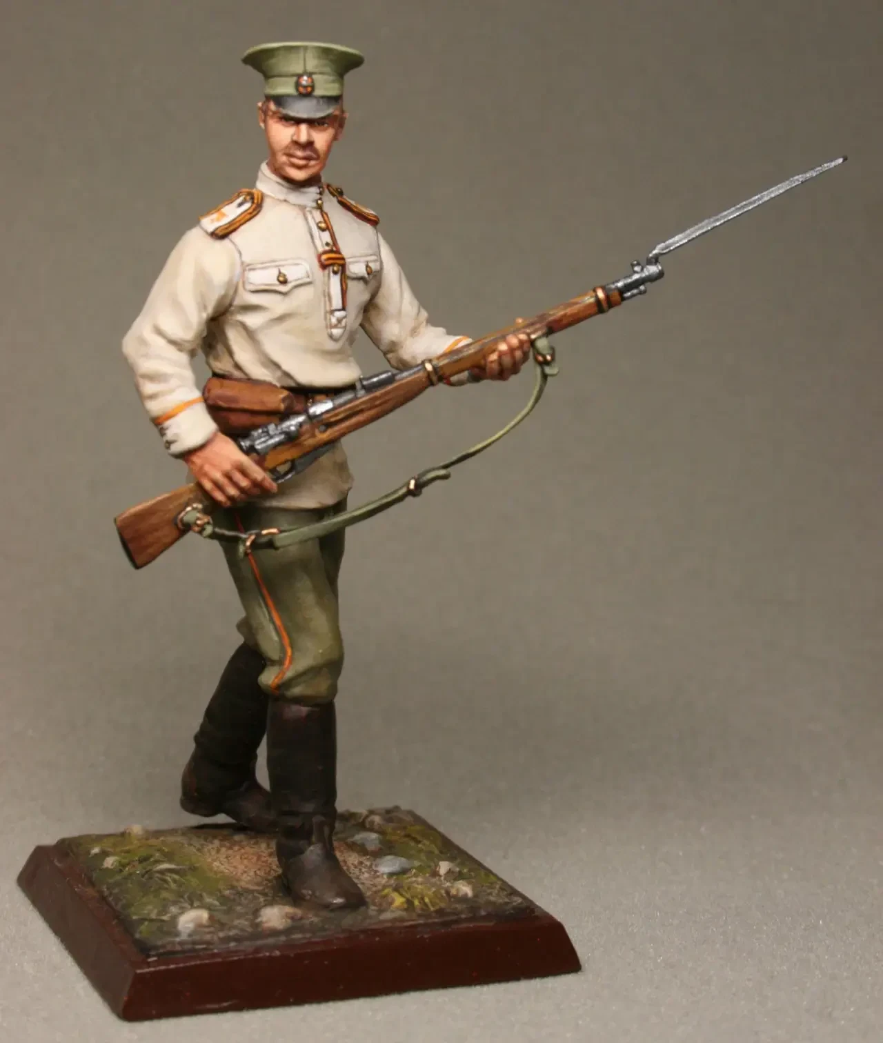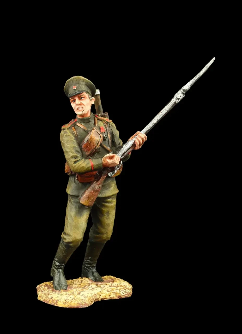 Фигурка рядового из полка георгиевских кавалеров. Солдат – георгиевский кавалер представлен в стандартном обмундировании на момент формирования таких полков в 1917 г. Мундир с белыми погонами, обшитыми по краям георгиевской ленточкой. По борту гимнастерки – узкая георгиевская ленточка, по обшлагам и на брюках – оранжевый кант. Вооружение: винтовка Мосина образца 1891 г. Высота фигурки: 75 мм. Производитель: «Эйджес. Санкт-Петербургская историческая коллекция»