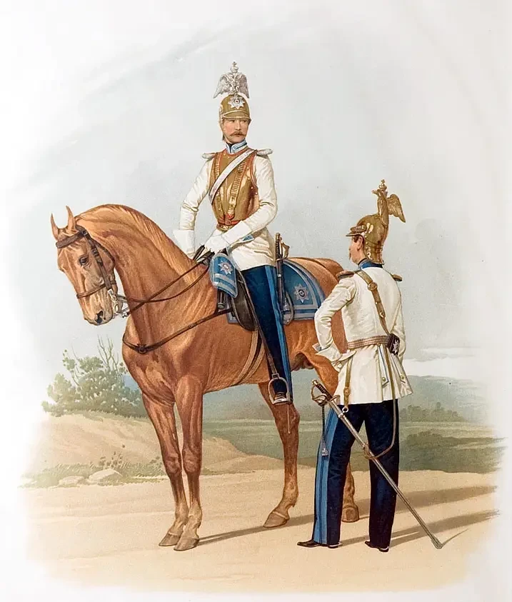 Обер-офицеры Лейб-Гвардии Кирасирского Его Величества и Лейб-Кирасирского Её Величества полков. (В парадной форме.) 15 марта 1855. Пиратский К. К. (1813–1871). Литография № 24 из издания «Перемены в обмундировании и вооружении войск Российской Императорской армии с восшествия на престол Государя Императора Александра Николаевича». СПб., 1857–1881