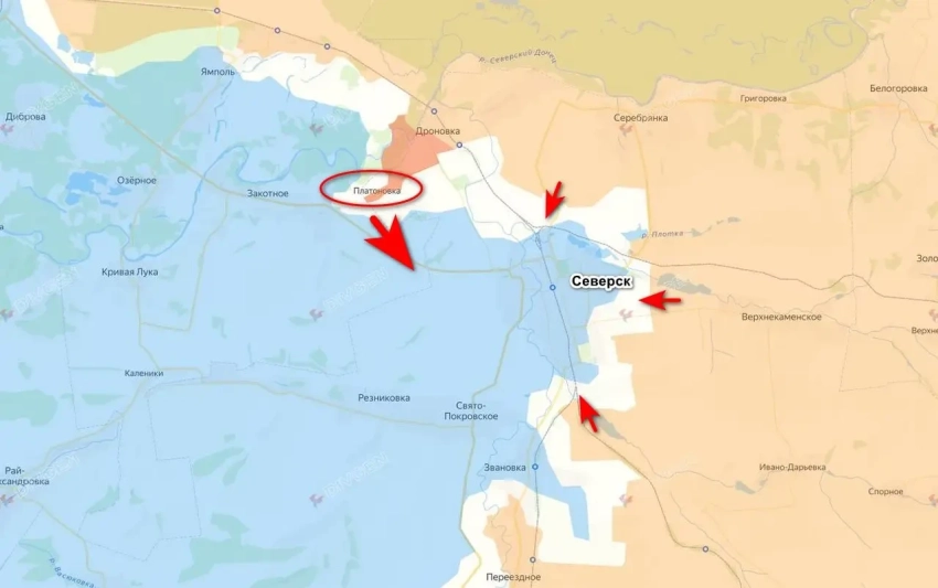 Как отмечают российские ресурсы, на данный момент в Северске сосредоточена довольно большая группировка противника, задачей которой является удержание города. Судя по сложившейся ситуации, наши не идут в лоб со стороны Верхнекаменского и Новоселовки, предпочитая зайти в тыл противнику. Платоновка — это как раз такой манёвр.