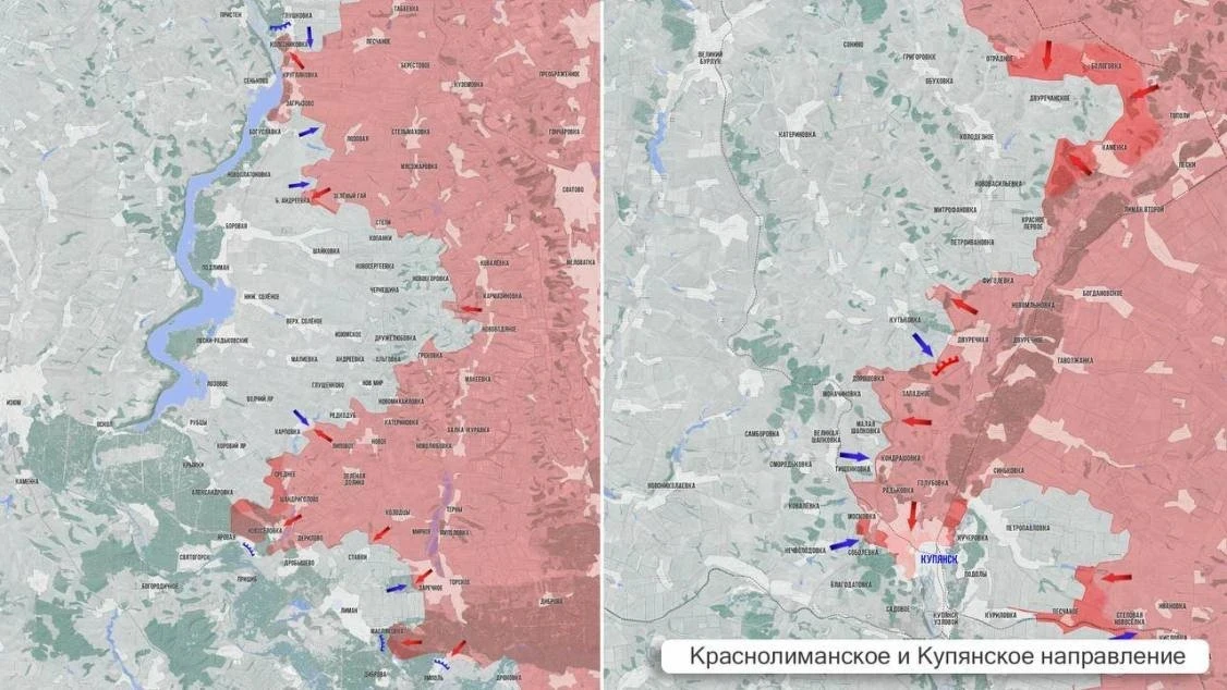 На Купянском направлении ВС РФ зачищают улицы в южной части города. ВСУ контратакуют западную часть Купянска с нескольких направлений, а также пытаются заводить в него ДРГ, которые практически целиком уничтожаются дронами. Ожесточённые бои идут вдоль восточного берега Оскола от Загрызово до Подолов. МО РФ сообщило об освобождении Двуречанского в районе Мелового – ВС РФ соединили плацдармы со стороны Хатнего-Амбарного и плацдарм в районе Тополей - Каменки.