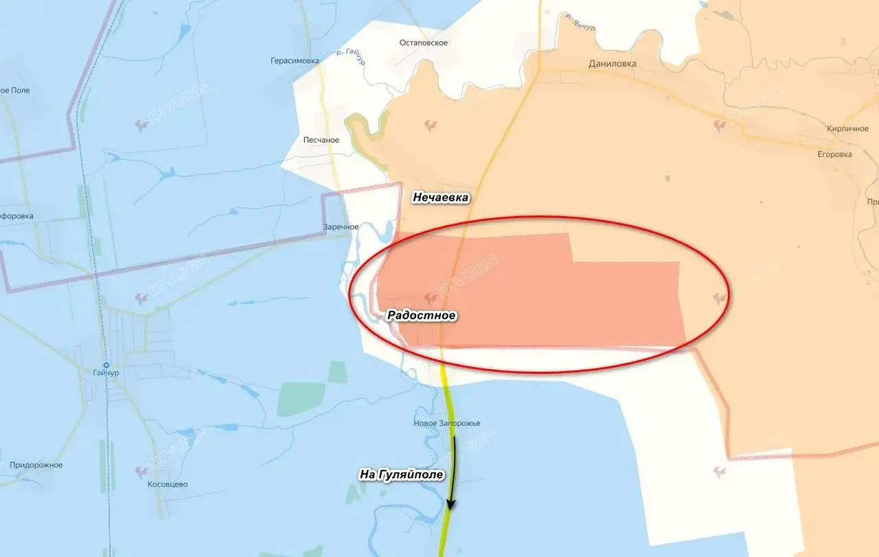 Село Радостное расположено на границе Днепропетровской и Запорожской областей, но относится к первой, хотя пару улиц заходит и во вторую. Рядом с селом протекает река Гайчур, по которой ВСУ пытаются выстроить новую линию обороны. Также через него проходит трасса Гуляйполе — Доброполье. Наши войска вошли в Радостное, сделав рывок сразу на 8 км и взяв под контроль порядка 30 кв. км территории.