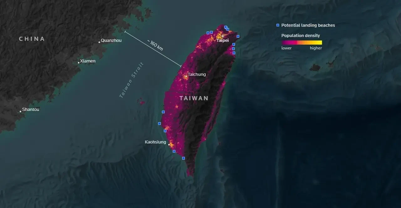Как отмечается, Китай отрабатывает высадку десанта через пролив, задействовав многочисленные гражданские суда, которые «отклоняются от обычных маршрутов, подходят к берегу в провинции Гуандун и выгружают военную технику прямо на песок». Утверждается, что анализ опирается на спутниковые снимки и данные автоматической идентификационной системы, отслеживающей местоположение кораблей: