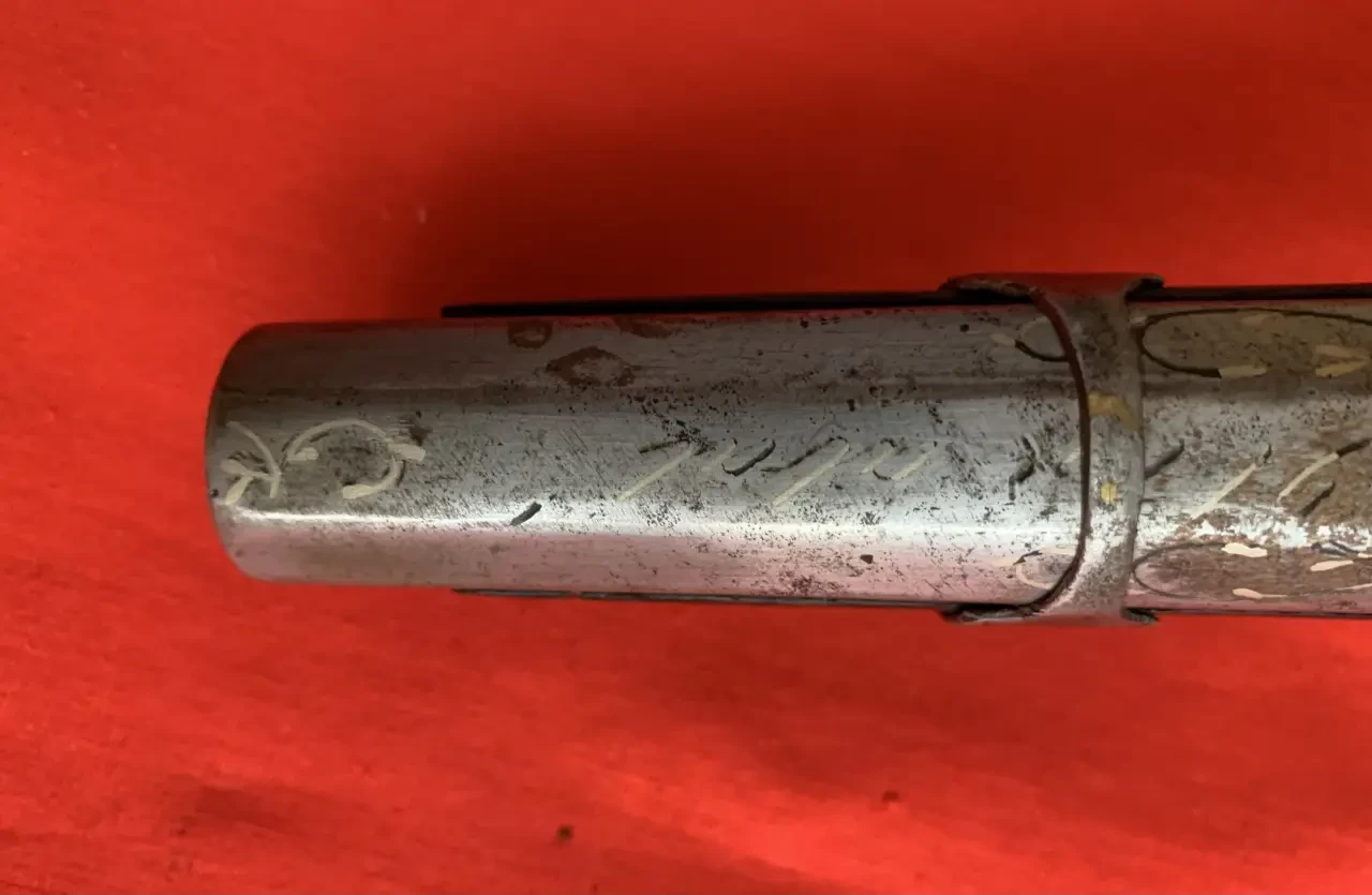 Восьмигранный ствол со сглаженными гранями имеет железные крепления, то есть это явно европейская работа, поскольку на Востоке предпочитали латунь, но украшен насечкой. Мушки нет, то есть целились из этого пистолета по стволу!